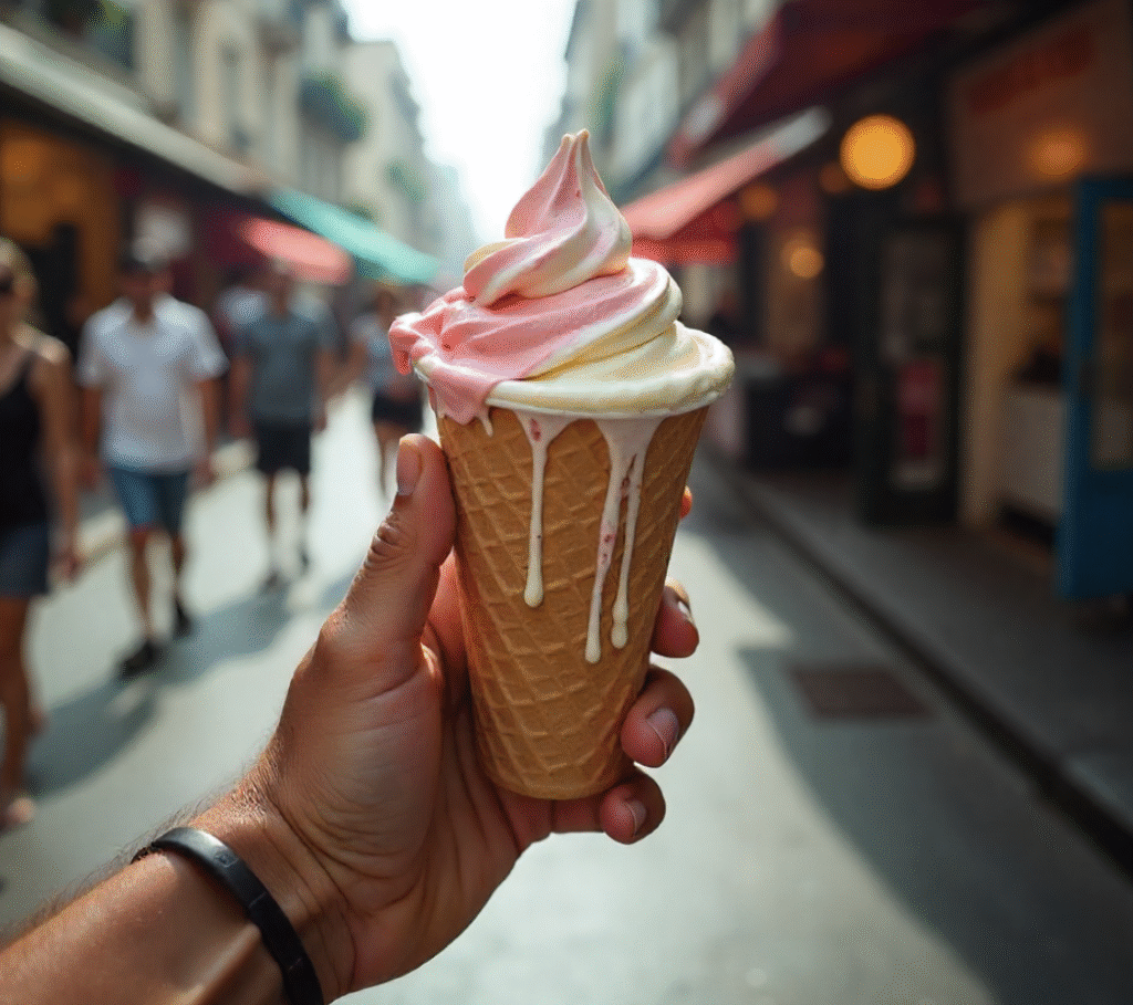 Dette er et modelfoto af en person, der holder en “vaffel med guf”-is.