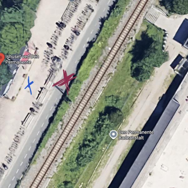 Det blå kryds markerer positionen, hvor vidnet Per Flyte befandt sig.